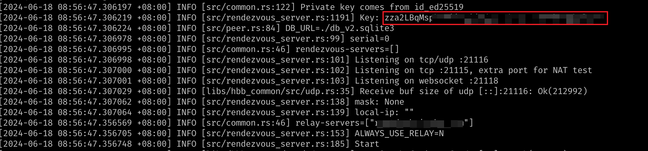 启动过程中,请注意记录下日志中的 key
