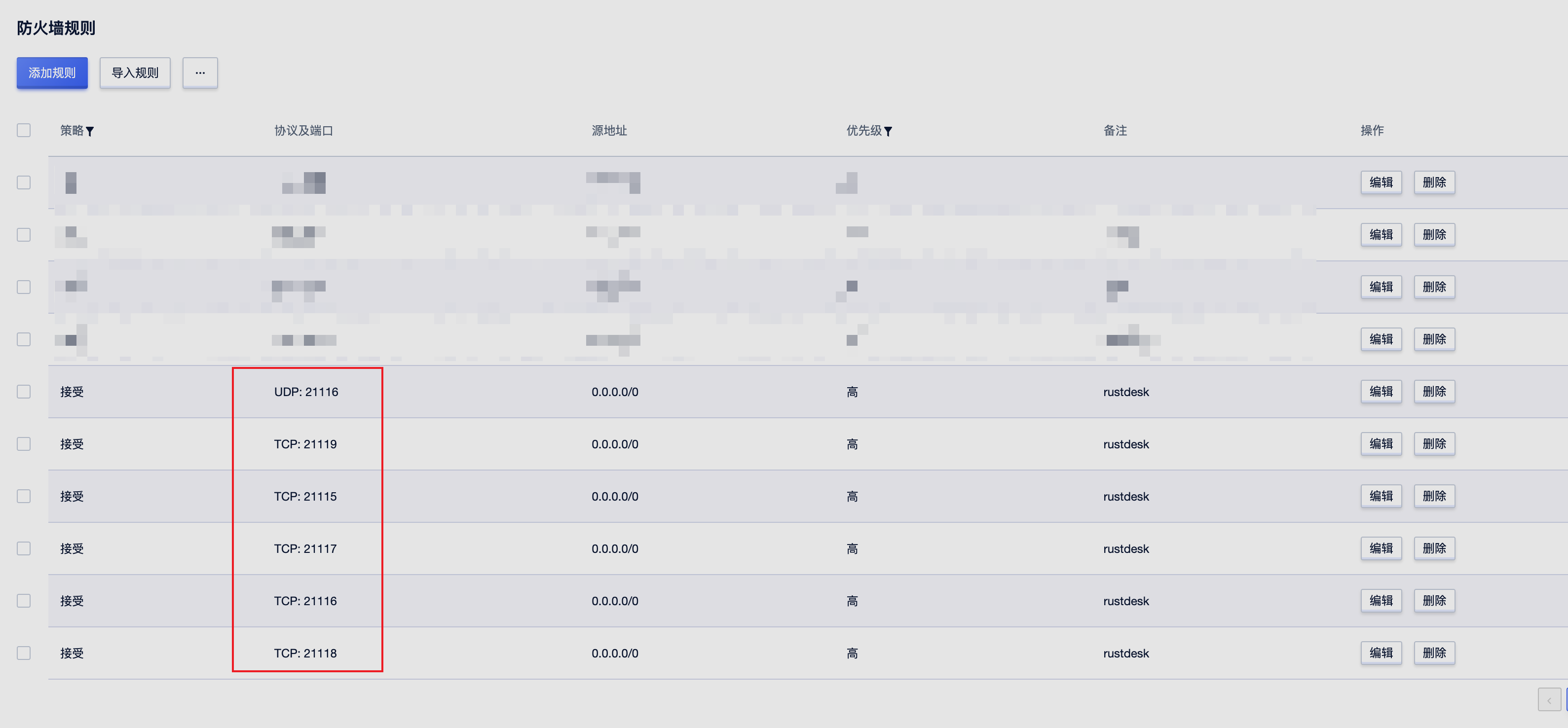 在开始使用前,请务必在服务器控制台上的防火墙开启这几个端口, 请注意21116同时要开启TCP和UDP。其中21115是hbbs用作NAT类型测试,21116/UDP是hbbs用作ID注册与心跳服务,21116/TCP是hbbs用作TCP打洞与连接服务,21117是hbbr用作中继服务, 21118和21119是为了支持网页客户端。如果您不需要网页客户端(21118,21119)支持,对应端口可以不开。