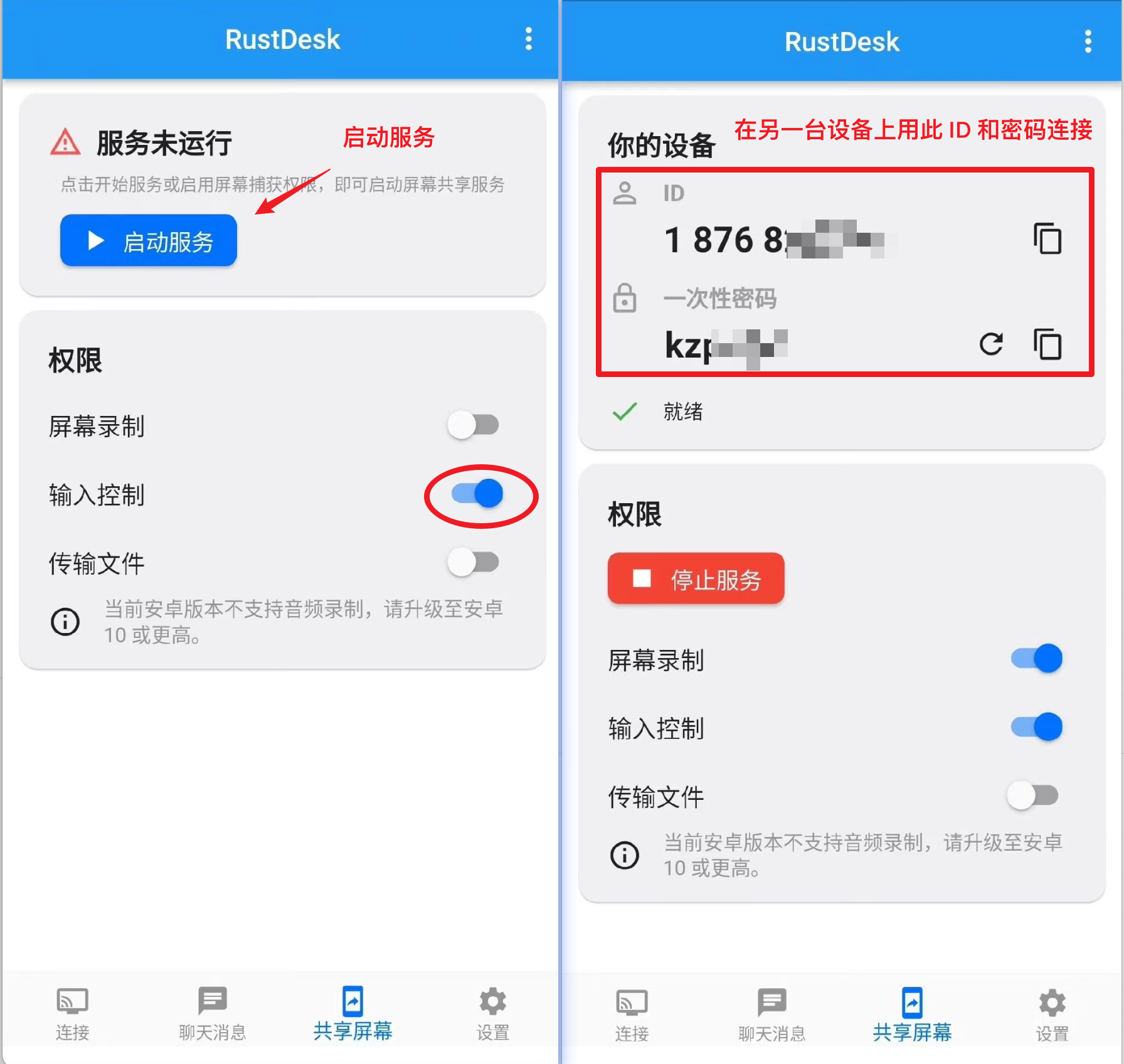 切换到 共享屏幕 启动服务,并且要打开 输入控制 否则只能查看屏幕无法控制,启动服务后,就可以用设备提示的 ID 和一次性密码在主控上输入进行连接,不过为后续更方便无人值守连接,可以在客户端为设备固定密码,然后在主控上用固定密码连接,注意点保存密码,下次就可以直接连接了~
