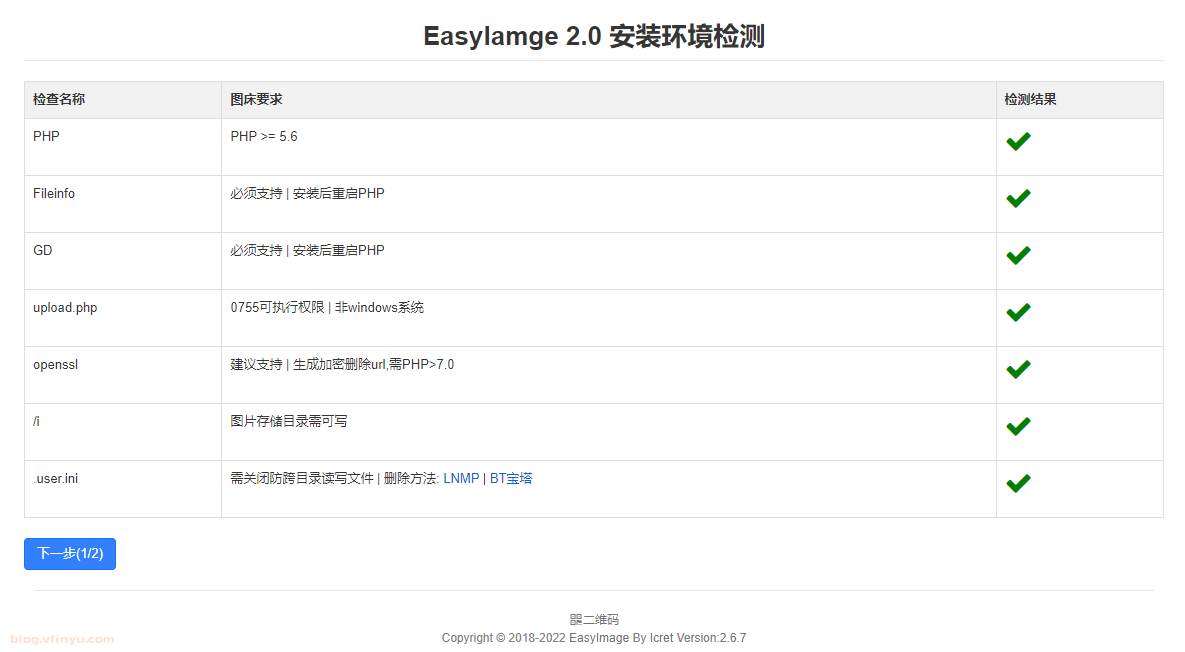 浏览器输入:http://ip:8899 第一次登录进入安装环境检测,我们时docker方式,这里的环境都是配置好的不需要手动调整。