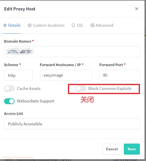 解决办法,使用nginx反代不要添加额外的安全设置。使用Nginx Proxy Manager,需要关闭阻止常见漏洞。