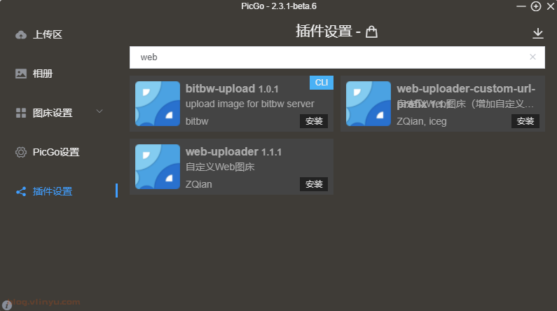 打开PicGo插件设置搜索web-uploader,这里我们安装1.1.1。