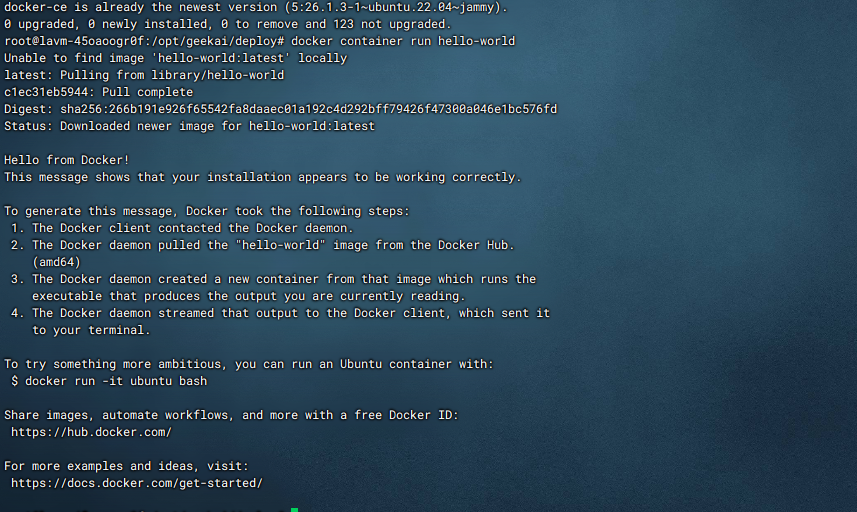 docker container run hello-world如果本地没有该镜像,这个命令将会下载测试镜像,在容器中运行它,打印出 “Hello from Docker”,并且退出。