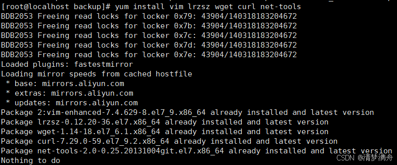 yum install vim lrzsz wget curl net-tools 因为之前已有这些软件,所以现在yum可用后显示Nothing to do