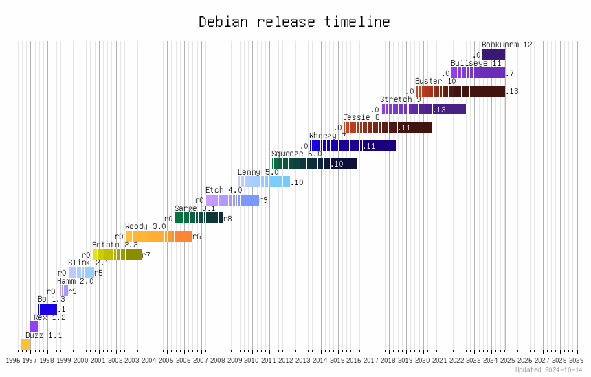 Debian 稳定版通常每隔两年发布一个版本,自发行后会得到为期约三年的正式支持,期间会不定期得到小版本更新与持续的安全更新以修复发现的重要问题。[29]